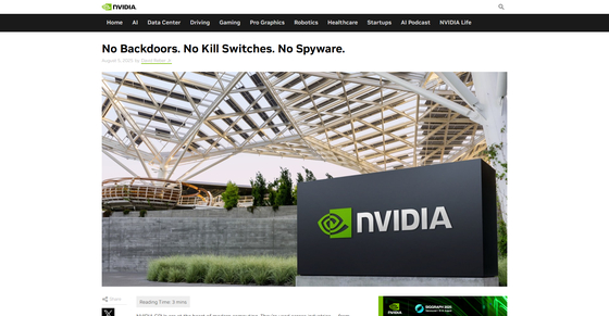 これに対して、NVIDIAは公式ブログで、自社のGPU製品に「キルスイッチ」や「バックドア」、「スパイウェア」といった機能を一切搭載しておらず、今後も搭載しないと強く主張しています。