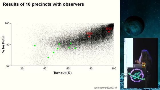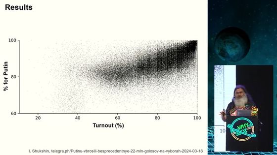 このドットの傾向を見ると、明白に「投票率が高い投票所ほど、プーチン大統領の得票率が高い」という不審な傾向が見られます。これは、投票率が高い投票所では票の改ざんが行われたことを示唆する兆候だとマカロフ氏は指摘しています。