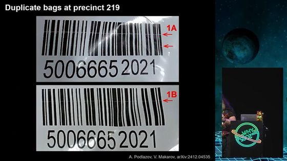 ある投票所では、テープだけでなく袋ごと複製に入れ替えられていたことが判明しました。上がすり替え前の識別番号のバーコード、下がすり替え後のバーコードです。よく見ると微妙にプリント時に入った線が異なることがわかります。