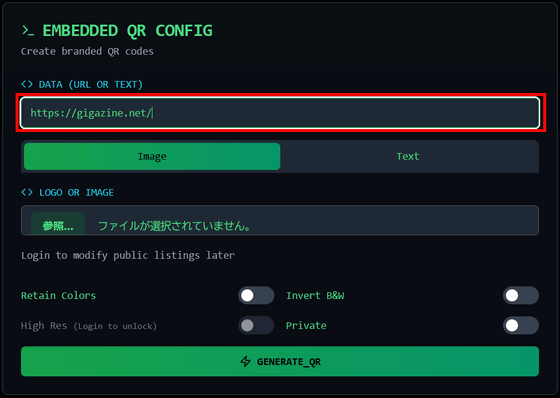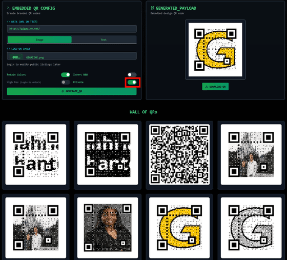 作成したQRコードはNitroQRのサイトに共有されます。「Private」のトグルスイッチをオンにしておけば、共有しないように設定してQRコードを作成できます。