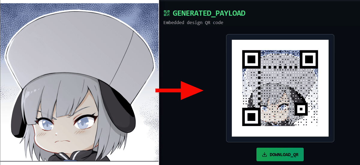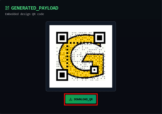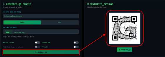 「GENERATE_QR」をクリックすると、アップロードした画像とQRコードが一体になったコードが生成されました。