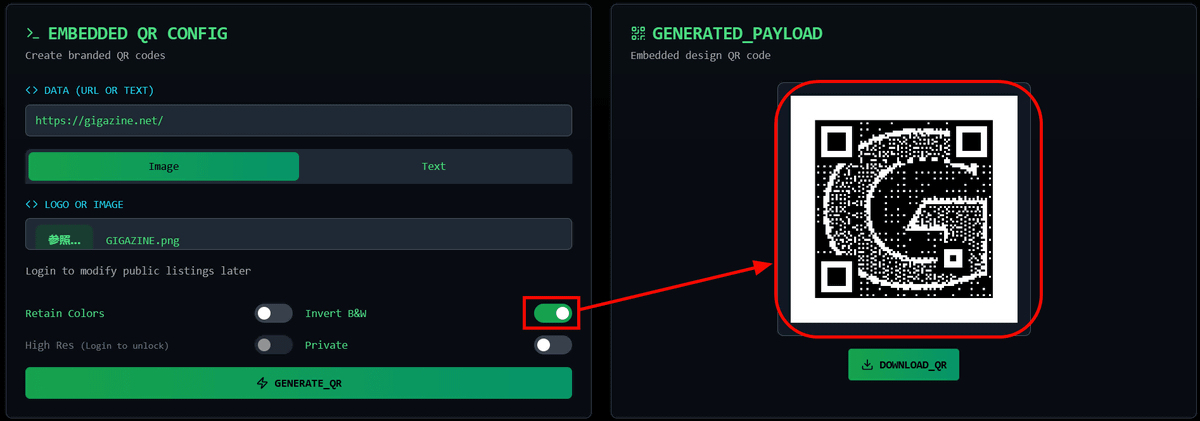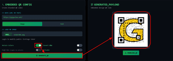「Retain Colors」のトグルスイッチをオンにして「GENERATE_QR」をクリックすると、QRコードがモノクロからカラーに変わります。