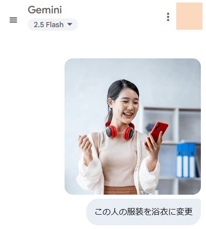 Geminiに画像と編集内容を入力します。今回は「この人の服装を浴衣に変更」と入力。
