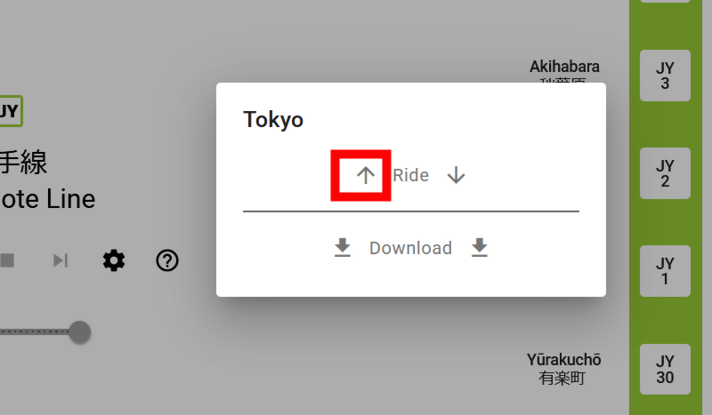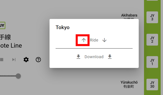すると、それぞれ2方向の矢印が記された「Ride」と「Download」という項目が表示されました。矢印は山手線の方向を示しており、路線図右側にある東京駅の場合、上方向の矢印が内回り、下方向の矢印が外回りとなります。「Ride」の左右にある矢印をクリックすると、指定した方向に進む車両に乗車した時の走行音や駅メロを体験することが可能。「Download」の左右にある矢印をクリックすると、それぞれの進行方向の車両に乗った時の駅メロをMP3ファイルでダウンロードできます。今回は上方向の矢印をクリックして、東京駅から内回り(上野方面)の車両に乗った際の音を体験してみます。