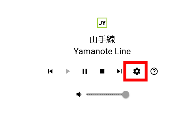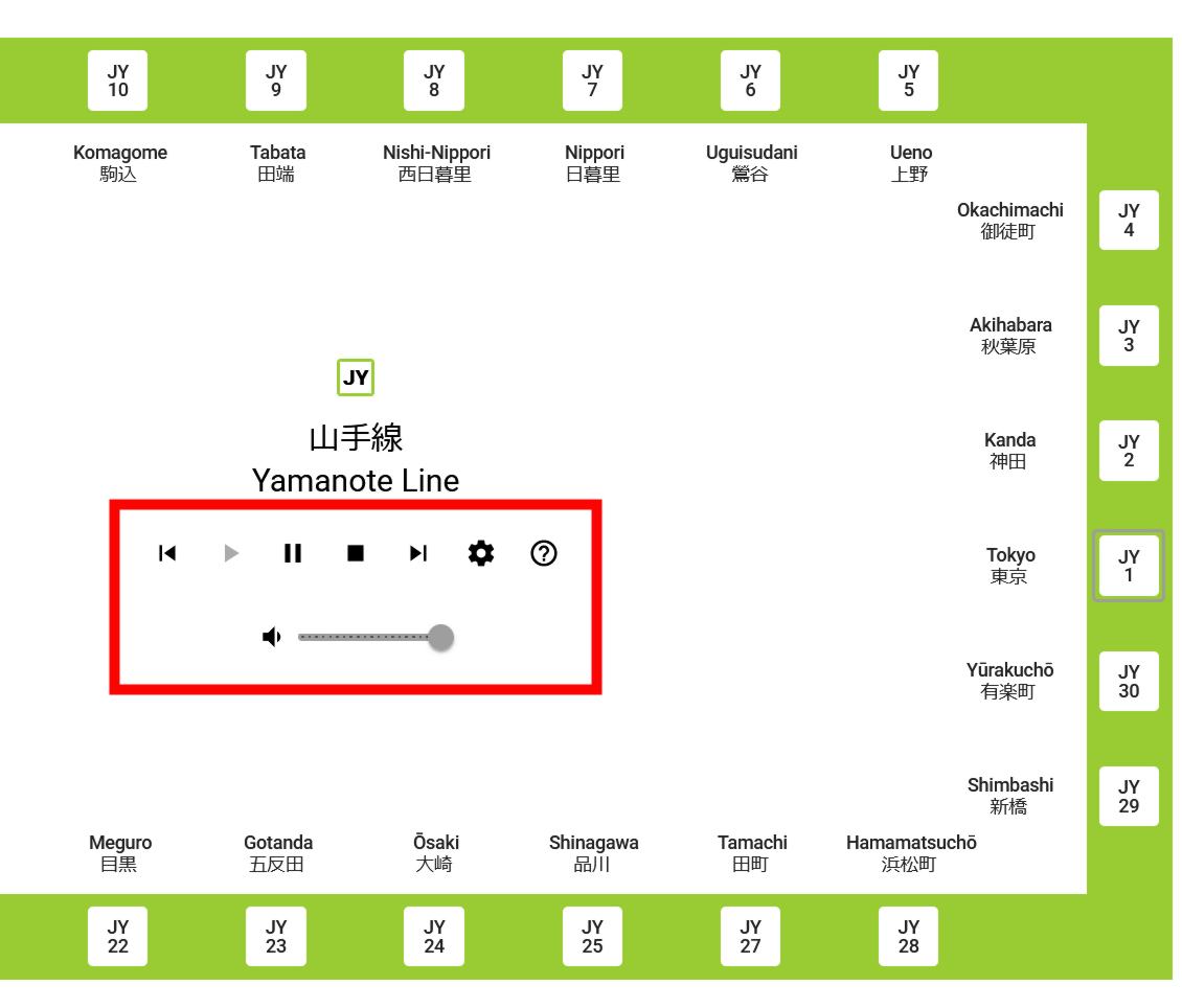 矢印をクリックすると、音声の再生がスタートします。音量や一時停止、一駅送り/戻しは中央のボタンで操作できます。