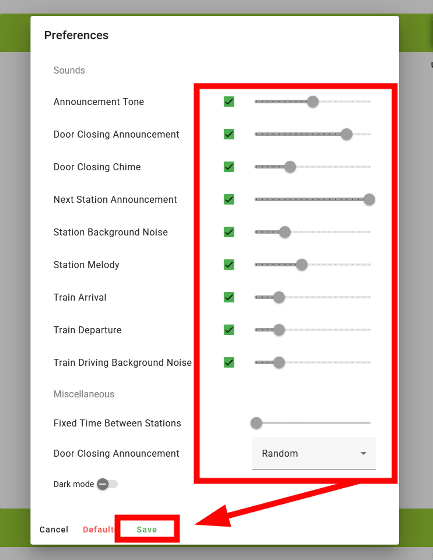 「Announcement Tone(アナウンスのトーン)」「Door Closing Announcement(ドアが閉まるアナウンス)」「Door Closing Chime(ドアが閉まるチャイム)」「Next Station Announcement(次の駅のアナウンス)」「Station Background Noise(駅のバックグラウンドノイズ)」「Station Melody(駅メロ)」「Train Arrival(列車の到着音)」「Train Departure(列車の発車音)」「Train Driving Background Noise(列車走行中のバックグラウンドノイズ)」など、多岐にわたる音声のオンオフや音量を設定できます。設定を変更したら、下部の「Save(保存)」をクリックすればOK。なお、この設定で「Train Driving Background Noise」をオフにした場合、無音になるのを避けるため駅間の走行時間はゼロになるとのことです。