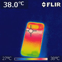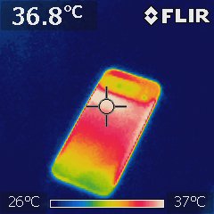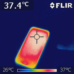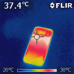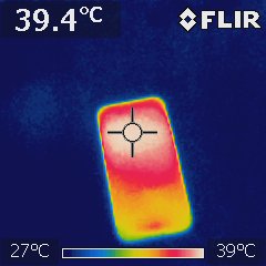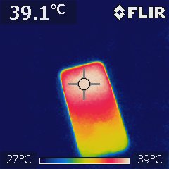 高負荷時の温度も気になるので、室温28度の部屋でAnTuTu Benchmarkを実行している際の温度を赤外線サーモグラフィー「FLIR i3」で測定してみました。Pixel 10のディスプレイ面は上部が39.1度まで上昇しました。