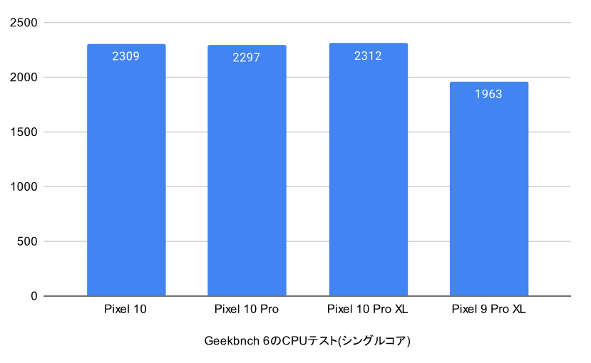 「Pixel 10」「Pixel 10 Pro」「Pixel 10 Pro XL」のCPUテスト(シングルコア)の結果をまとめたグラフが以下。参考用に「Pixel 9 Pro XL」でもテストを実施しました。最高スコアはPixel 10 Pro XLの2312で、その後にPixel 10(2309)とPixel 10 Pro(2312)が続きます。無印モデルとProモデルに大きな差はなく、ほぼ横ばいです。