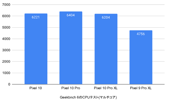 マルチコアでのテスト結果は以下の通り。スコアはPixel 10が6221、Pixel 10 Proが6404、Pixel 10 Pro XLが6204でした。