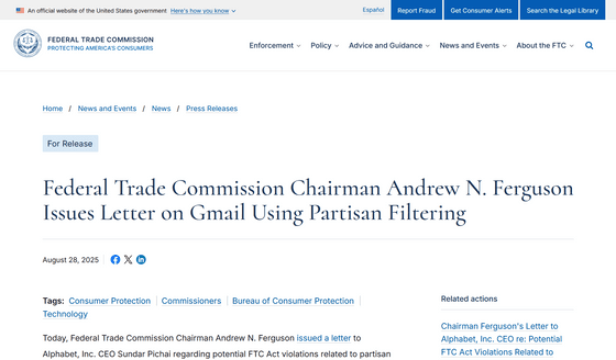 アメリカ連邦取引委員会(FTC)のアンドリュー・ファーガソン委員長が、「Gmail」のフィルタリングは偏向的であるとして、Googleに是正を求める書簡を送付しました。