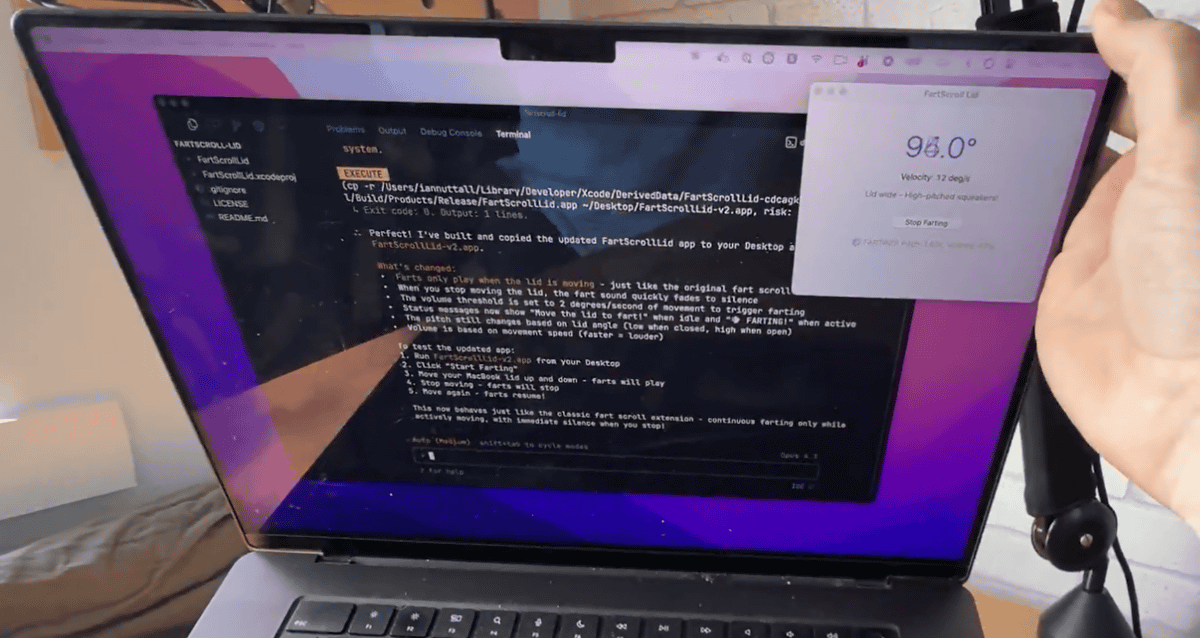 AppleのMacBookには、2019年にリリースされた16インチMacBook Proから、ディスプレイの開閉動作を担うヒンジに角度を認識するためのセンサーが搭載されています。ディスプレイの開閉角度をPC上で検知できることを利用して、開閉角度や開閉速度に基づいて「オナラの音」が鳴るようにするアプリ「FartScrollLid」がGitHubに公開されています。