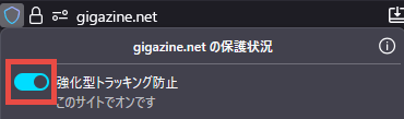 もしフィンガープリンティング保護によりサイトが正常に動作しない場合は、アドレスバーのシールドアイコンをクリックして表示されるパネルで「強化型トラッキング防止」のスイッチをオフにすると、このサイトのみで保護機能が無効になります。