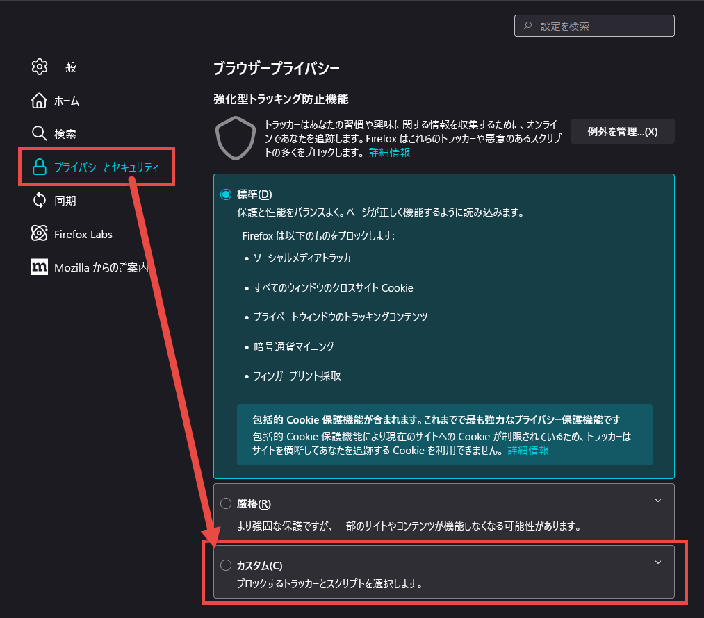 「カスタム」の場合の設定手順は次の通り。まず設定画面を開き、「プライバシーとセキュリティ」タブの「強化型トラッキング防止機能」セクションで「カスタム」を選択します。