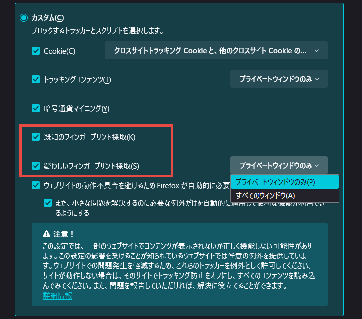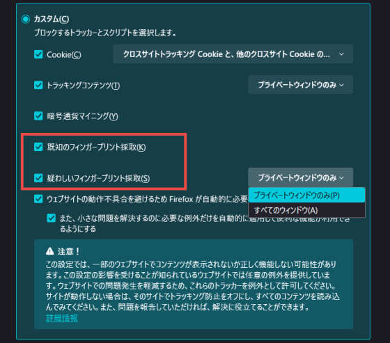 カスタムオプションから「既知のフィンガープリント採取」と「疑わしいフィンガープリント採取」のオン・オフを切り替えられます。また、「疑わしいフィンガープリント採取」についてはプライベートウィンドウのみで動作させるかすべてのウィンドウで動作させるかを選択できます。