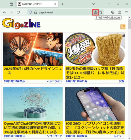 ウェブサイトをウェブアプリとしてインストールするには、サイトを表示した状態でアドレスバーの右端にある「タブをタスクバーに追加」ボタン(赤枠で囲ったボタン)をクリックします。