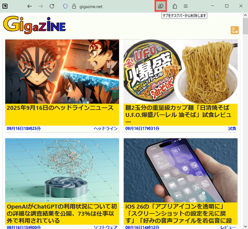 アドレスバーの右端に配置されている「タブをタスクバーから削除」ボタンをクリックすると、ウェブアプリがアンインストールされ、タスクバーやスタートメニューからアイコンが消去されます。