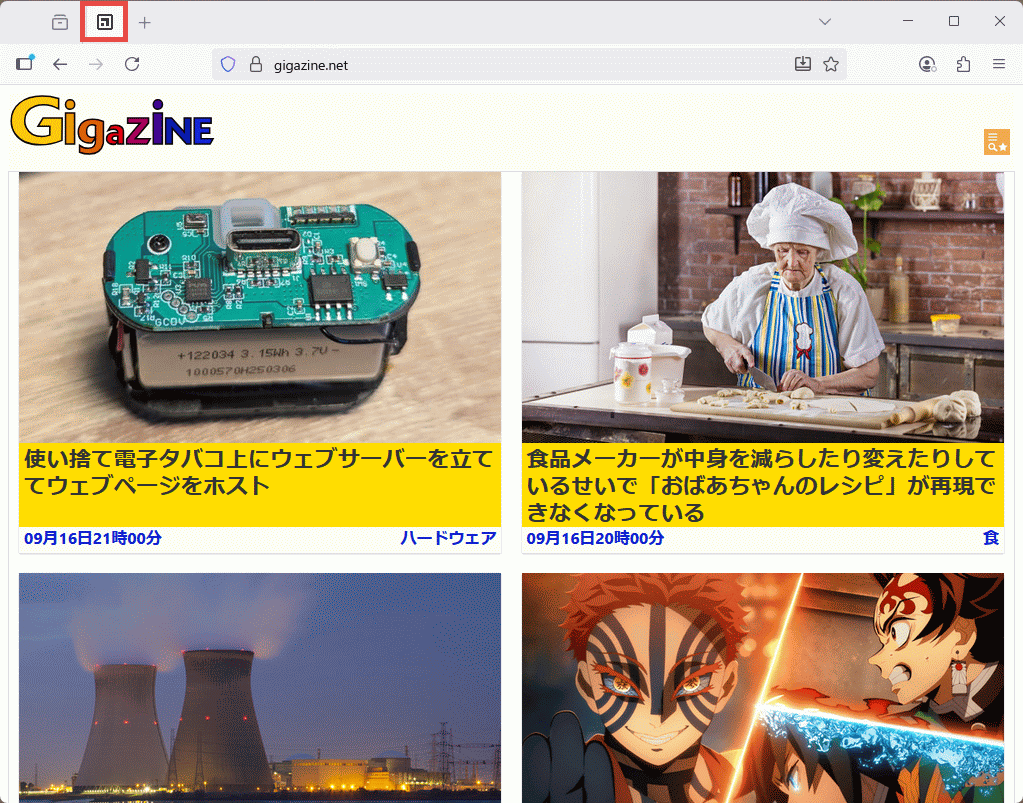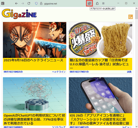 タスクバーやスタートメニューのアイコンをクリックすることで、ウェブアプリ化したサイトを独立したウィンドウとして開くことができます。通常の表示とは異なり、タイトルバーが表示されていないのが特徴。一方でアドレスバーや拡張機能ボタンは引き続き表示されており、翻訳アドオンやCookie管理アドオンなどをそのまま使うことができます。