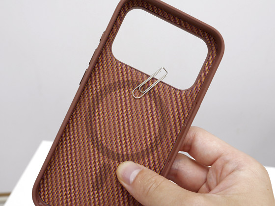 MagSafeに対応していて、各種アクセサリをカバーの外側に装着できます。試しに金属クリップを近づけると磁力でくっつきました。