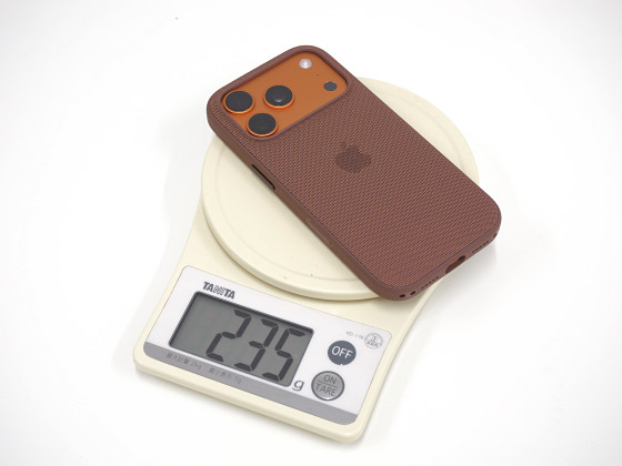 iPhone 17 Proに「MagSafe対応iPhone 17 Proテックウーブンケース」を装着した際の重さは235gでした。