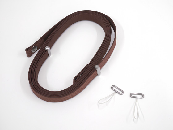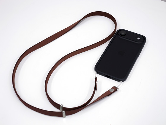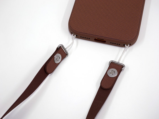 クロスボディストラップは2本の平たいヒモを金具でつなぎ止める構造です。ヒモの中には磁石が埋め込まれており、ヒモ同士がピタッとくっついて1本の長いストラップとして機能します。