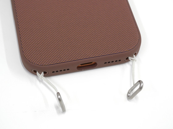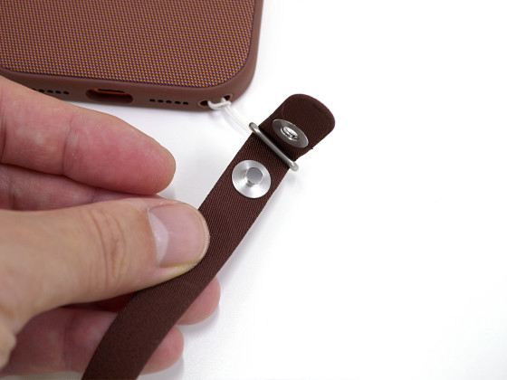 取り付け方は次の通り。まず、リング付きのヒモを対応ケースのストラップ穴に装着します。