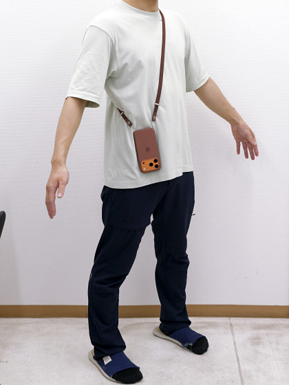長さは1080mmから2080mmの間で調整可能。一番短くした状態で身長164cmの編集部員がたすき掛けするとこんな感じです。