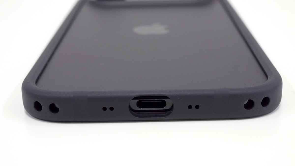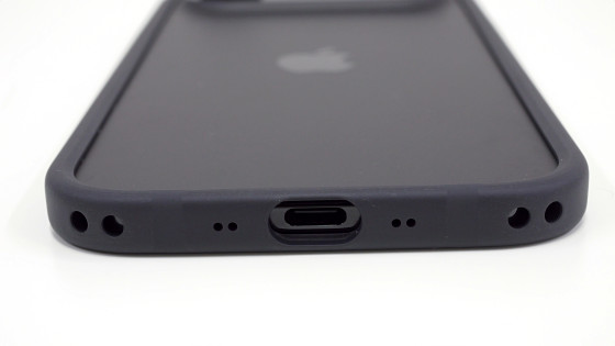 底面の両側にストラップ穴が設けられており、別売りのクロスボディストラップを装着できるようになっています。また、USB Type-Cポートの周囲はスペースが広めに確保されています。