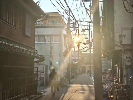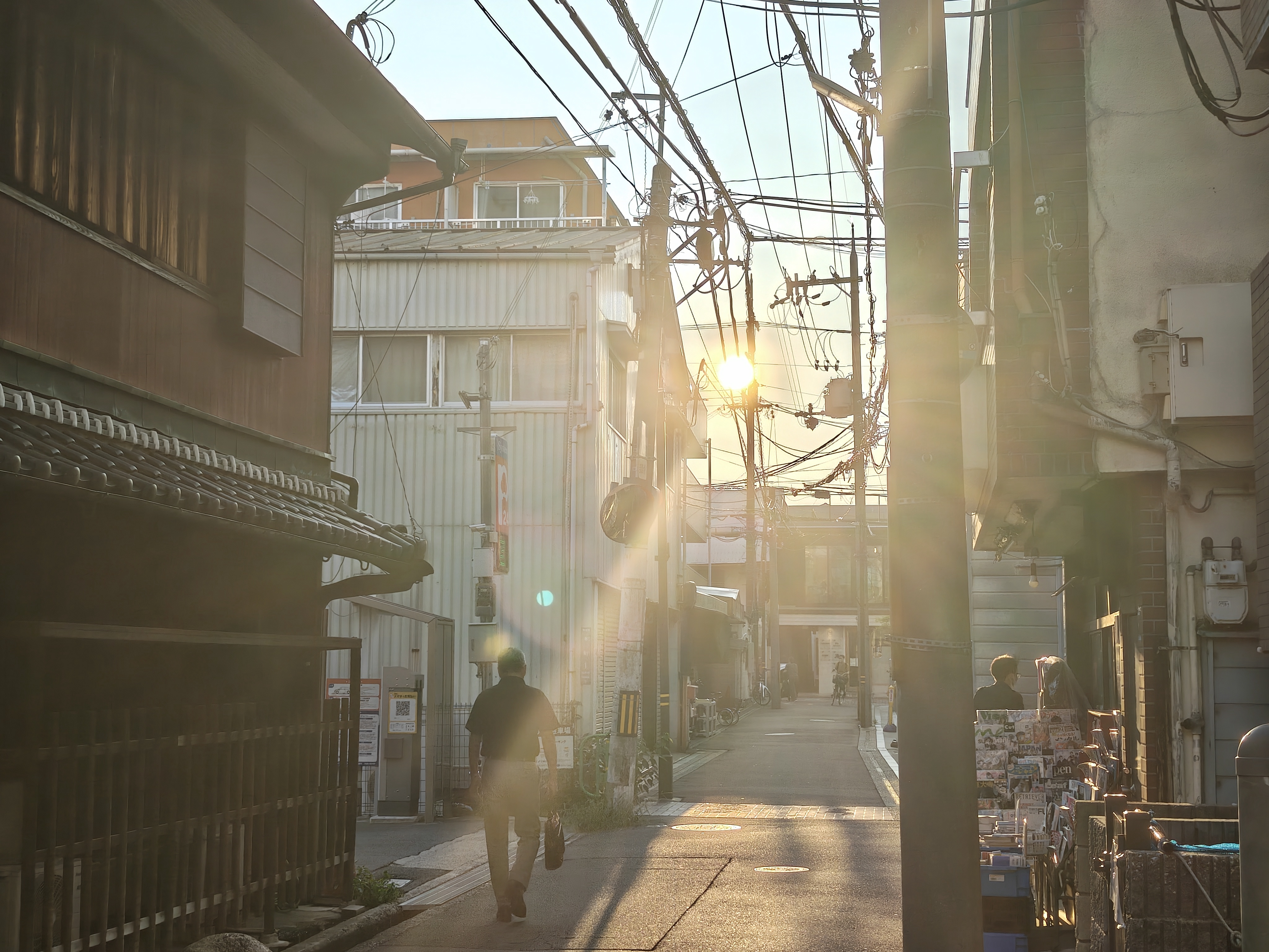夕方に撮影した写真。夕日が映り、建物の隙間から差し込んでいます。解像度は4096×3072ピクセル。
