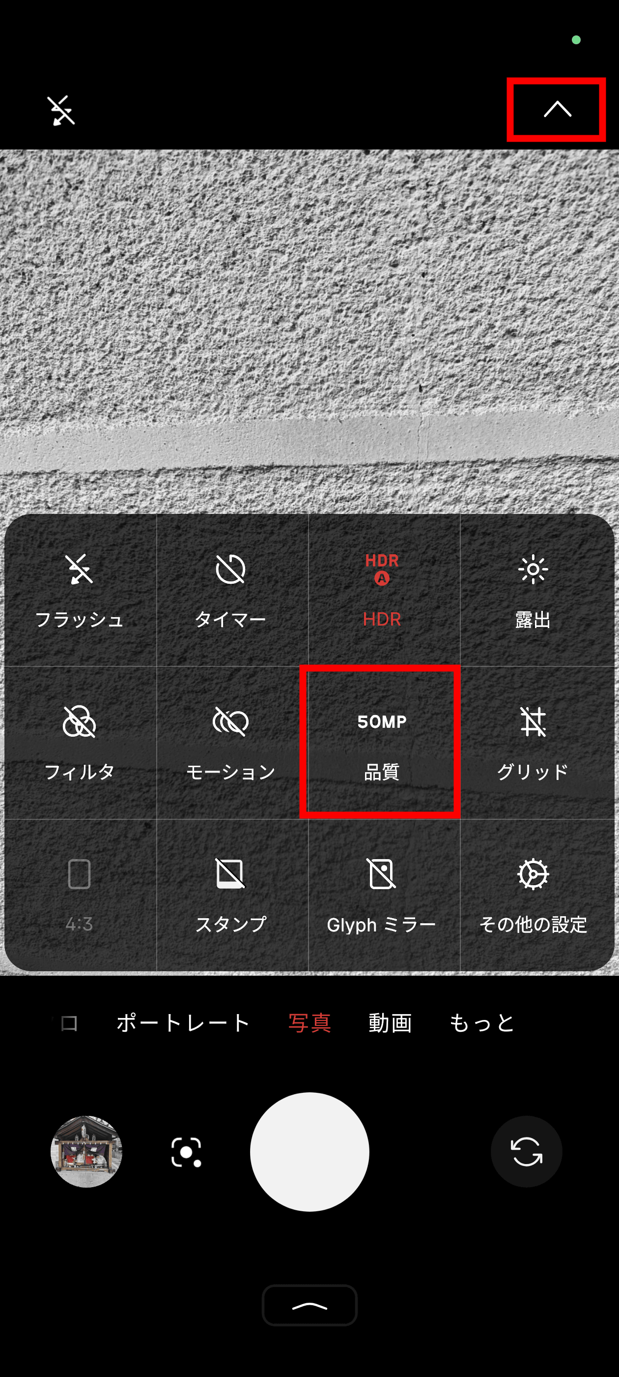 写真のデフォルト解像度は12メガピクセルで、右上のアイコンをタップして「品質」の欄をタップして「50MP」に切り替えることで、5000万画素の写真を撮影できるようになります。