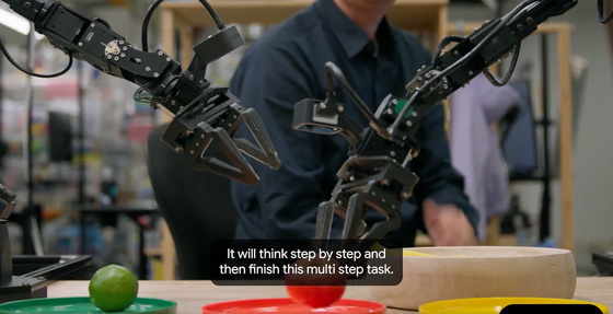 Google DeepMindが公開したGemini Robotics 1.5のデモムービーでは、Gemini Robotics 1.5を搭載したロボットアームが、「3種類のフルーツを同じ色の皿に取り分ける」というタスクを実行しています。