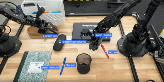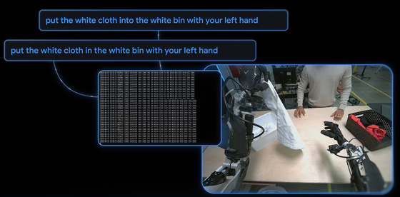 次に、「洗濯物を色別に分類する」というタスクを与えた場合、Gemini Robotics 1.5は白い服は白いカゴに、色のついた服は黒いカゴに入れて洗濯物を区分し、カゴの位置を移動させたり入れ替えたりしてもタスクを完了しています。視覚から世界を理解した上で、「タスクを実行するには、白い服は白いカゴに入れる」とタスクを完了させるための動作を思考して実行することができます。