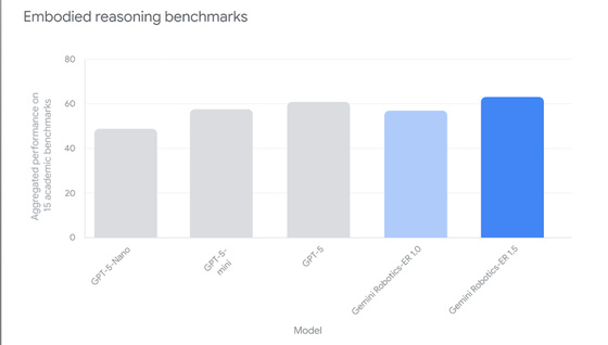 Gemini Robotics-ER 1.5は身体性推論向けに最適化された初の思考モデルで、学術ベンチマークと社内ベンチマークの両方で最先端のパフォーマンスを達成しています。