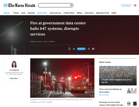 韓国政府の法令情報システム、公務員の行政ネットワーク、モバイル身分証サービスなど、合計647基に上る業務システムを扱う大田国家情報資源管理院で2025年9月26日に火災が発生しました。火はおよそ22時間後に消し止められ、一部のサービスは提供を再開していますが、すべてのサービスが復旧するには相当の時間が必要だとみられています。