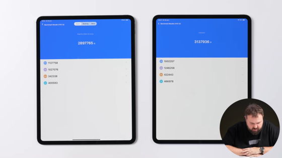 動画ではベンチマークテストも実施しています。Geekbenchを用いたCPUのベンチマークテストから、M5にはM4搭載iPad Proと同じ9コアCPUが搭載されており、L2キャッシュは4MBから6MBに増加したことが確認されています。M5搭載iPad Proのシングルコアスコアは「4133」で、M4と比較して約10%向上。マルチコアスコアは「1万5437」で、M4から約15%向上しています。