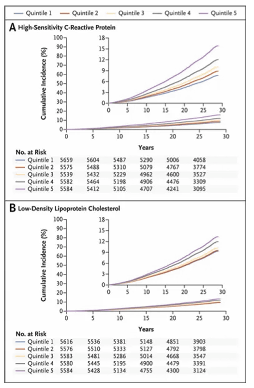 以下のグラフは、上がhs-CRPの数値と心臓病の発生率を、下がLDLコレステロール値と心臓病の発生率を表したもの。横軸が測定時から経過した年を、縦軸が心臓病の発生率を示しており、被験者はそれぞれの数値に基づいて5分割されています。最も数値が悪い下位20%が「Quintile 5(紫色)」、その次に悪い20%が「Quintile 4(黒色)」、その次の20%が「Quintile 3(黄色)」、その次の20%が「Quintile 2(赤色)」、最も数値がいい上位20%が「Quintile 1(青色)」となっており、いずれの数値も心臓病の予測因子として機能しています。しかし、hs-CRPとLDLコレステロール値を比較すると、hs-CRPの方が将来的な心臓病発生率の予測精度が高いことがわかります。