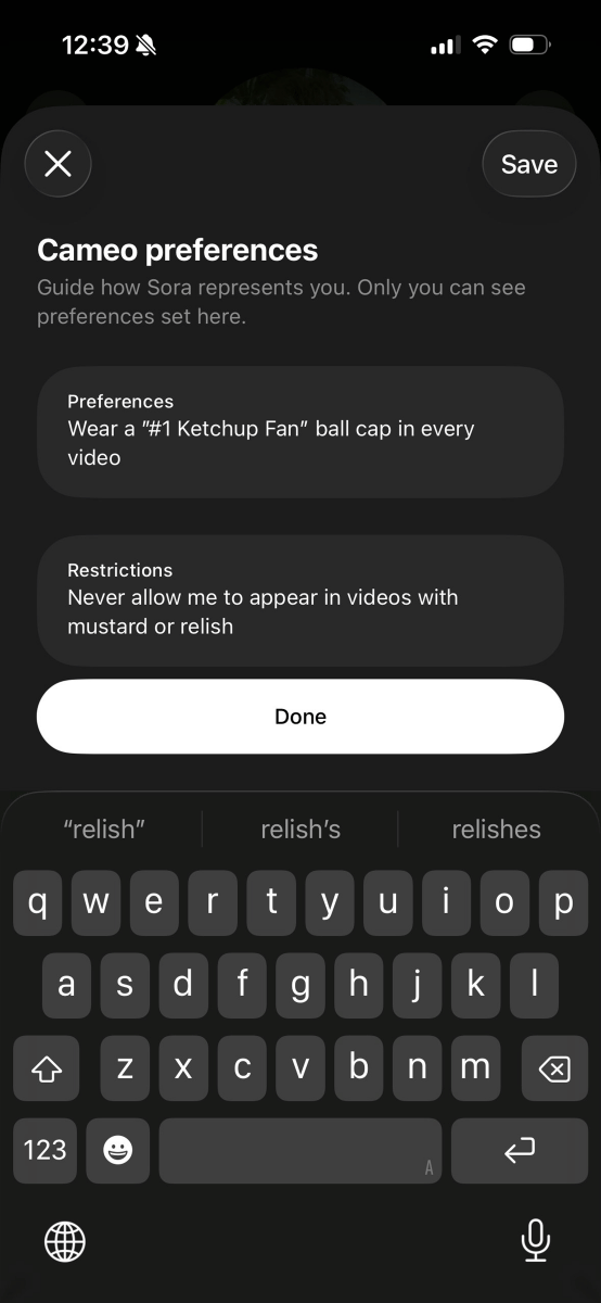 開発チームの一員であるトーマス・ディムソン氏が公開した「自分がどのように動画に使われるかを制御できる機能」のスクリーンショットが以下。ユーザーは「政治的な言説を含む動画に自分を登場させてはならない」「○○という言葉をしゃべらせてはいけない」「すべてのビデオで○○を着用している必要がある」といった制限を自然言語で記述することができます。
