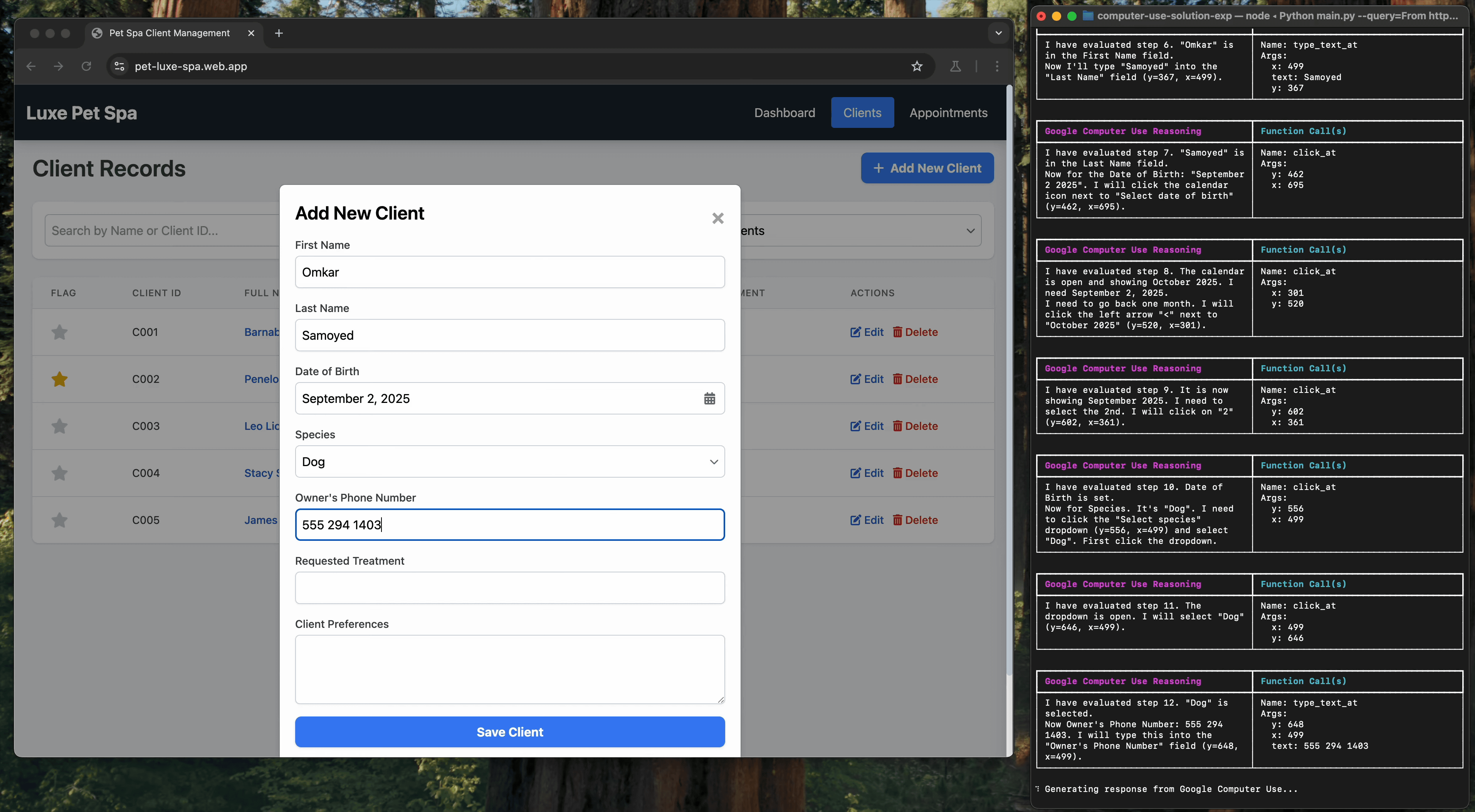 実際にGemini 2.5 Computer Useにタスクを指示したところが以下。プロンプトは「指定したURLから、カリフォルニア州在住のペットに関する詳細情報をすべて取得し、当スパの顧客管理システムにゲストとして登録してください。その後、専門家アニマ・ラヴァールによるフォローアップ診察を10月10日午前8時以降の任意の時間帯に設定してください。診察の理由は、依頼された治療内容と同じです」というもの。