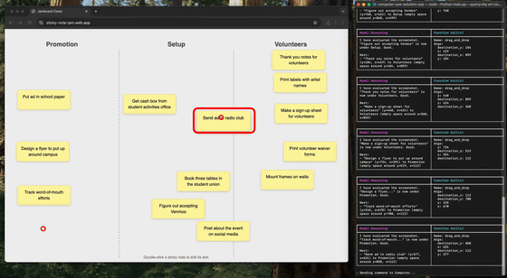 「美術部で展示会に向けたタスクをブレインストーミングしました。ボードがごちゃごちゃしているので、私が作ったカテゴリーにタスクを整理するお手伝いをお願いします。指定したURLにアクセスし、ノートが正しいセクションに明確に分類されていることを確認してください。分類されていない場合はドラッグして移動させてください」というプロンプトで作業させた場合が以下。