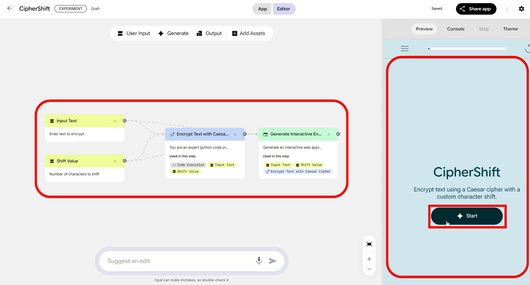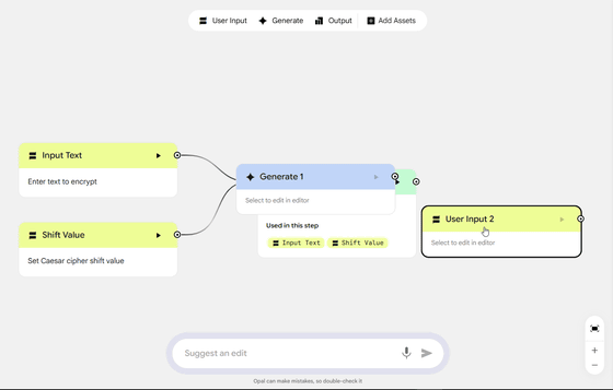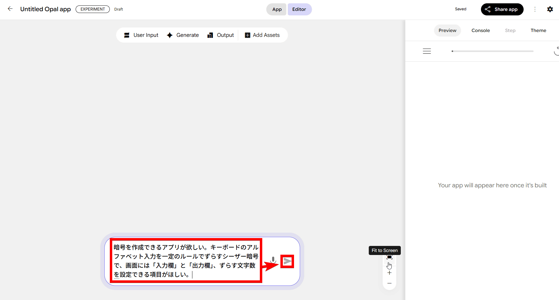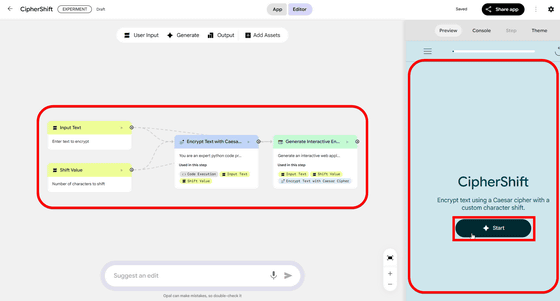 Opalでは、任意のステップをクリックしてプロンプトを確認または編集したり、ツールバーを使用して新しいステップを手動で追加したりできます。また、作成したアプリをウェブに公開し、リンクを共有して他のユーザーが自分のGoogleアカウントでテストできるようにすることも可能です。