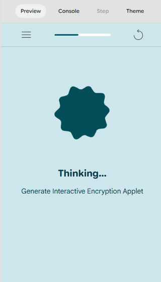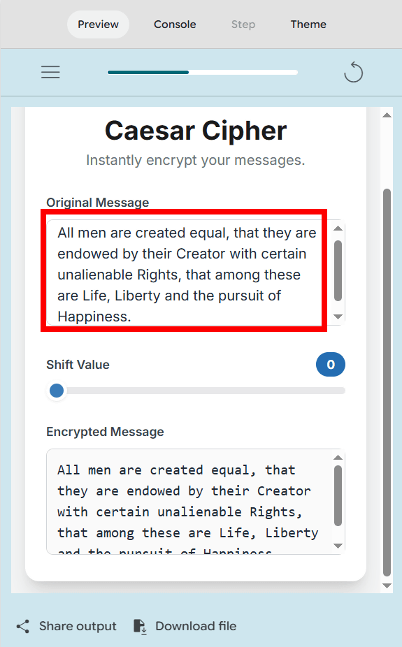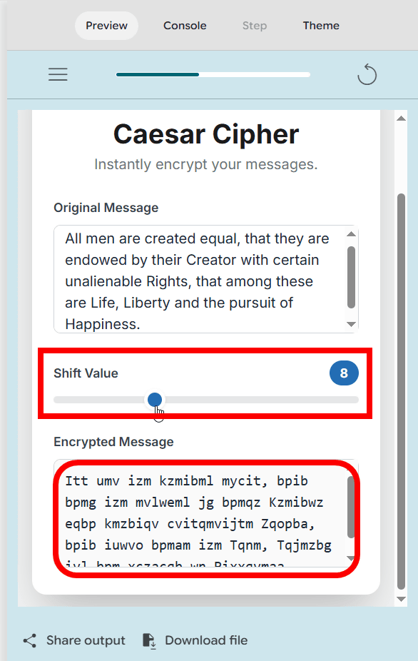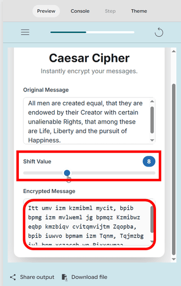 「Shift Value」のスライドバーを動かすことで、ずらす文字数を指定できます。ぐいっと「8」に動かすと、すべてのアルファベットが8文字分ずれた英文が表示されました。まさに思い描いていた通りのアプリで、めちゃくちゃシンプルなアプリではあるものの、これがわずか数分でできてしまうことに驚き。