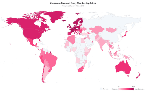 以下は、Chess.comにおけるプレミアムアカウントの価格を世界地図にマッピングしたもの。色が濃い地域の方が価格は高く、色の薄い地域は安い価格で提供されています。色がついていない地域はサービスが提供されていないもしくはデータが得られなかった地域です。世界地図を見ると、アフリカや南アジア、東南アジアでは特に安くなっており、現地の購買力をおおよそ反映していると考えられます。