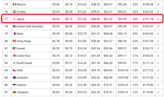 ベイギ氏のサイトでは、調査対象となった126か国全ての価格ランキングが表で確認できるほか、JSONデータファイルがGitHubで公開されています。なお、2025年10月1日時点の価格において日本は安い順で77位であり、アメリカを基準とした価格割合は「22%安い」とされていました。なお、日本ではFriends&Familyプランの国境を越えた利用はできません。