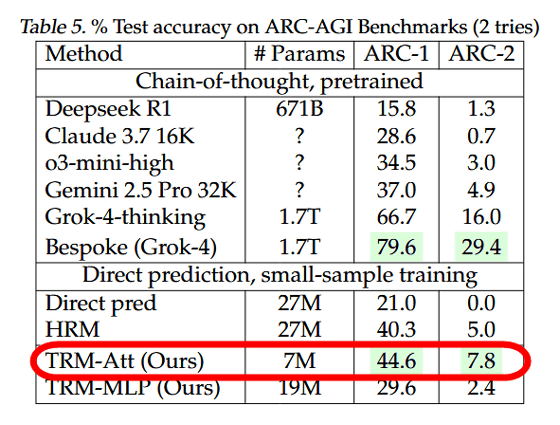 AIの知能を測定できるベンチマーク「ARC-AGI-1」と「ARC-AGI-2」の結果が以下。TRMは「Deepseek R1」「Claude 3.7 16K」「o3-mini-high」「Gemini 2.5 Pro 32K」より高いスコアを示しています。