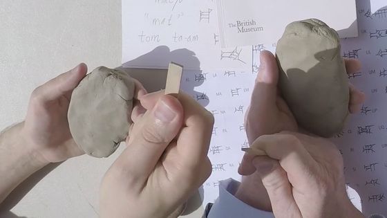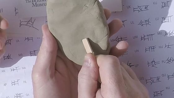 それでは実際に楔形文字を書いてみます。フィンケル氏がスタイラスとして好んで使っているのはアイスキャンディーの棒だそうです。