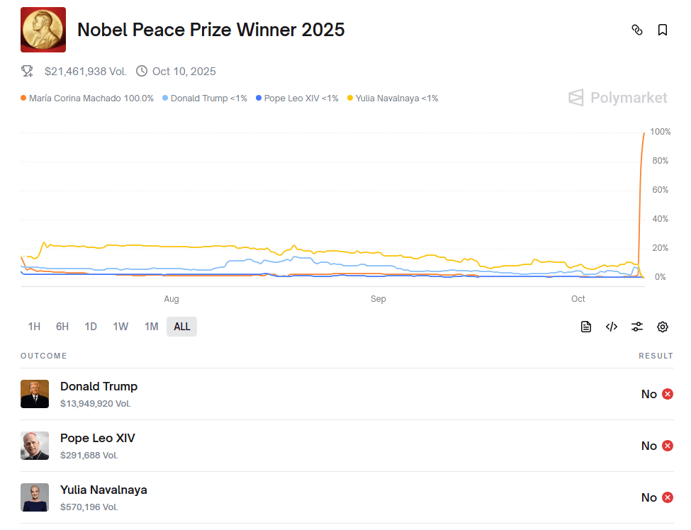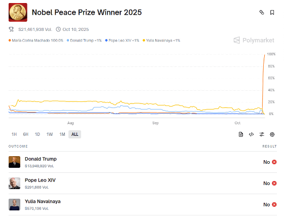 なお、現実世界の出来事の結果を予想して金銭を掛けるウェブサービス「Polymarket」では2025年のノーベル平和賞受賞者を予想する賭けが実施され、受賞発表直前までは2024年に死去したロシアの民主主義活動家アレクセイ・ナワリヌイ氏の妻であるユリア・ナヴァルナヤ氏が予想率1位でした。