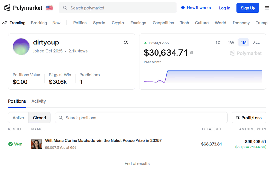 受賞発表前にマチャド氏の受賞を予想していたユーザーは少なかったのですが、dirtycupというユーザーはマチャド氏の受賞に6万8373.81ドル(約1042万円)を賭けて9万9008.51ドル(約1509万円)を勝ち取っています。このdirtycupと名乗るユーザーはこれまでPolymarketの賭けに参加したことがなく、「ノーベル平和賞の受賞者発表当日に初めて賭けに参加し、マチャド氏だけに大金を賭け、約500万円を稼いだ」という特筆するべき成果を挙げたことから「ノーベル賞選考委員会の関係者なのか、はたまたマチャド氏の熱心な支持者なのか」という疑いの目を向けられています。