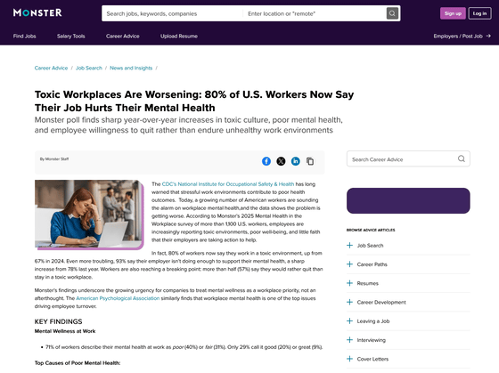 総じて、「職場環境が有害」という回答は80%で、2024年の同じ調査の67%と比べて13ポイント増加。また、「会社のメンタルヘルス支援が十分ではない」という回答も2024年の78%から93%に増加しており、Monsterは企業がメンタルヘルス対策を最優先課題として取り組むことの緊急性を指摘しています。