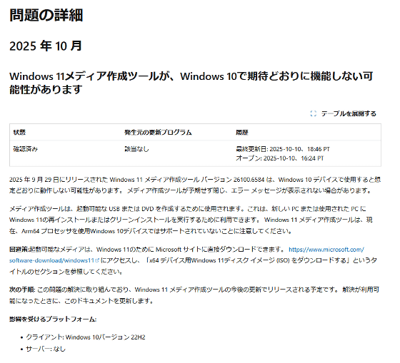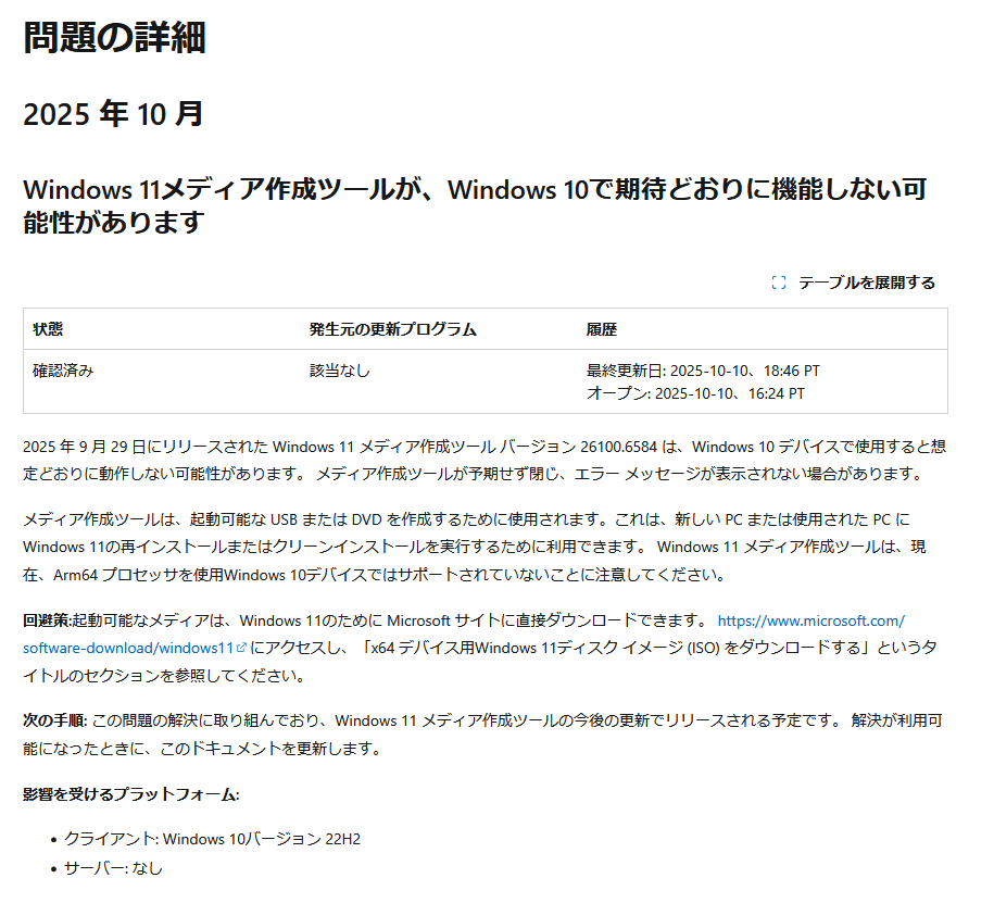 ところが、2025年9月29日にリリースされた「Windows 11 メディア作成ツール バージョン 26100.6584」で「Windows 10ではWindows 11 メディア作成ツールを起動できず、エラーメッセージも表示されない」という問題が発生していることが明らかになりました。つまり、「Windows 10のサポート終了までにWindows 11にアップデートしようと考えてWindows 11 メディア作成ツールを使おうとしても、起動できずエラーメッセージも表示されずアップデート作業を続行できない」という状況に陥っているというわけです。