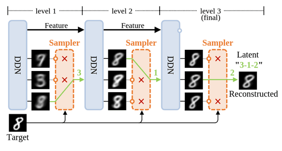 ターゲットデータのより細かい詳細を捕捉するため、DDNは第1レイヤーで生成された大まかな結果からグラウンドトゥルース(GT)に最も近い出力を選択。次に、第1レイヤーで選択された出力を第2レイヤーの条件としてネットワークにフィードバックし、GTにより類似した新しい出力を生成します。この要領で複数のレイヤーを経ることで、DDNの出力の表現空間は指数関数的に拡大し、生成されるサンプルはますますGTに類似するようになっていくというわけ。この離散分布の階層的な出力パターンは、DDNに独自の特性、すなわちより一般的なゼロショット条件付き生成と、一次元潜在表現を与えます。