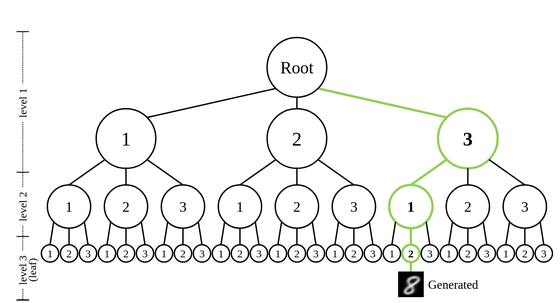 DDNの潜在変数のツリー構造表現空間を示したのが以下の図。各サンプルはこのツリーのリーフノードにマッピングできます。